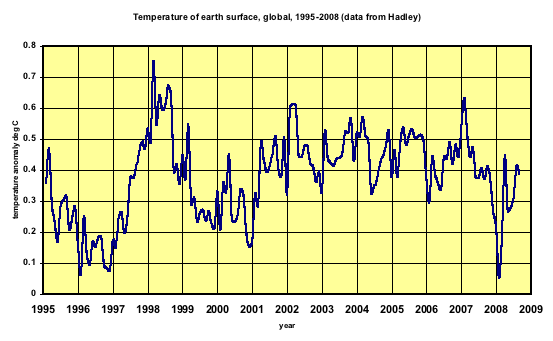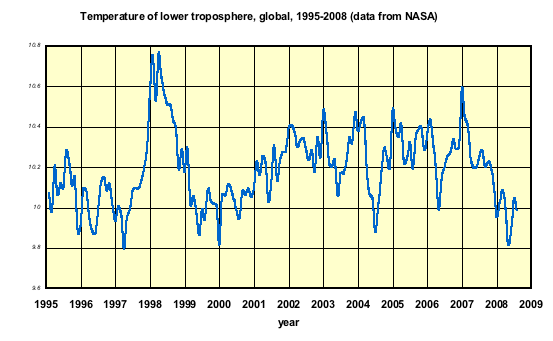 It has been widely discussed if the satellite-derived global temperature measurements that show only little warming should be more reliable than the temperatures obtained on the ground that show more warming. But after 1995 both sources show about the same, (see graphs below drawn from Hadley-data (ground) and satellite data (NASA)).